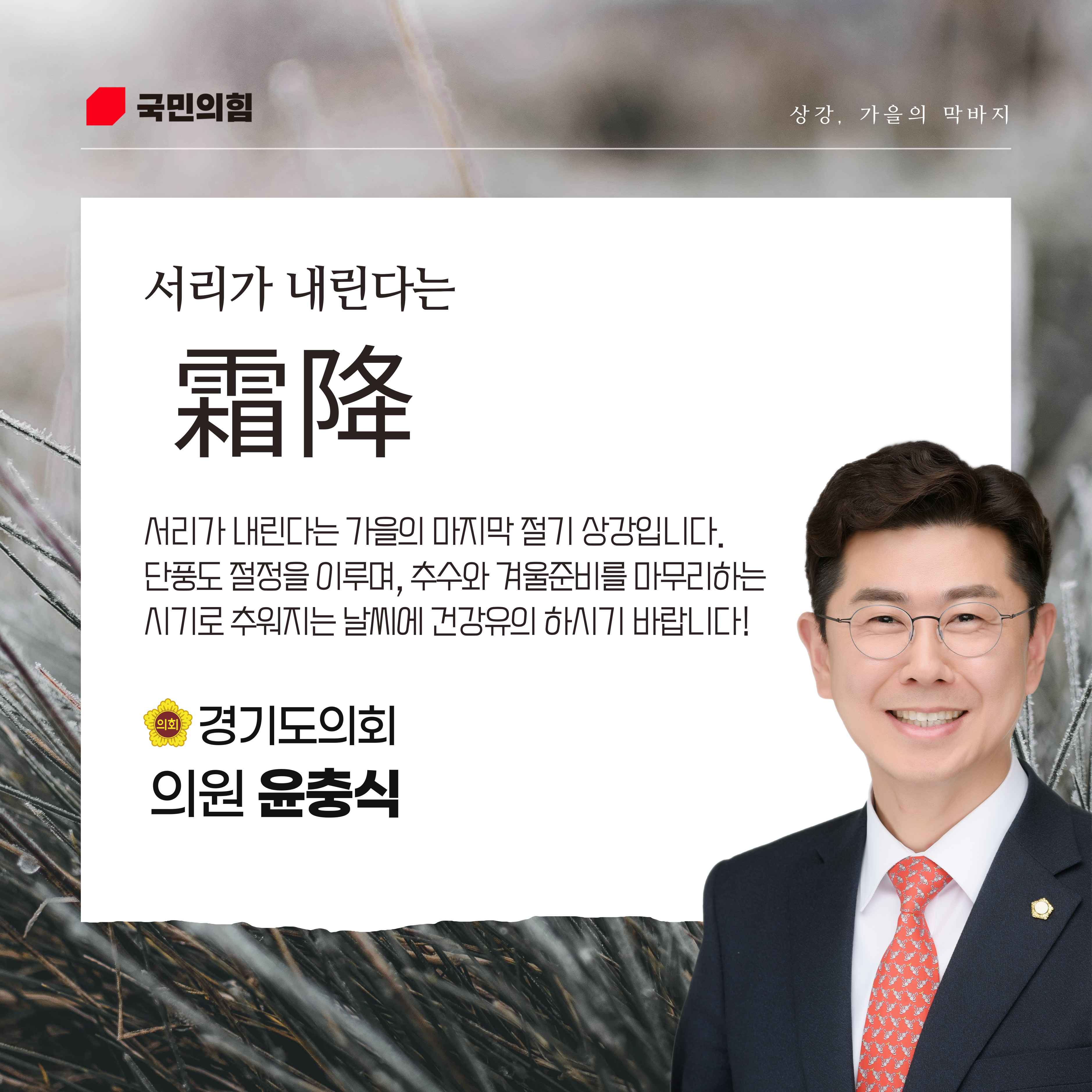 🍂 서리가 내린다는 상강이 찾아오니 가을이 한층 더 깊어졌습니다. 점점 차가워지는 날씨 속에서도 마음만은 따뜻하게 보내시길 바랍니다. 들녘은 수확으로 분주하고, 떨어지는 낙엽을 보며 가을의 여유를 만끽할 수 있는 시기입니다. 건강 잘 챙기시고, 얼마 남지 않은 가을의 남은 시간도 풍성한 행복으로 채워지시길 바랍니다!
