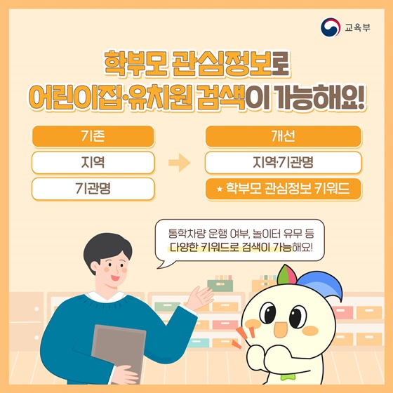 학부모 관심 정보를 바탕으로, 통학차량 운행 여부, 놀이터 유무 등 다양한 키워드로 검색해 원하는 기관을 쉽게 찾을 수 있습니다.