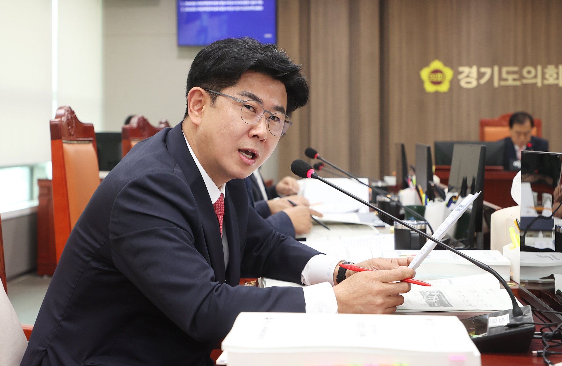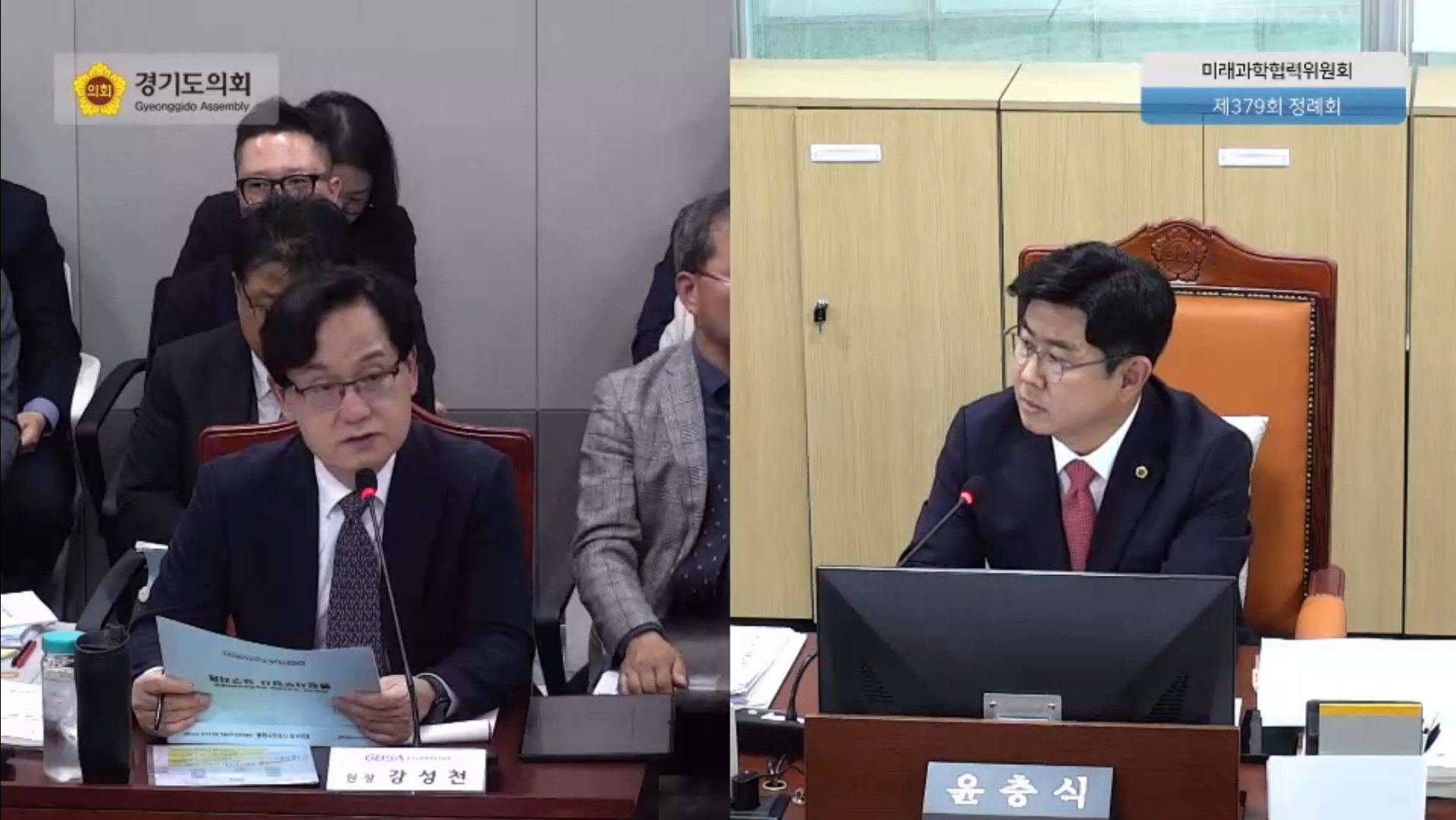 상임위 회의실에서 진행된 행정사무감사에서 차세대융합기술연구원과 경기도경제과학진흥원의 문제점이 지적되었습니다.