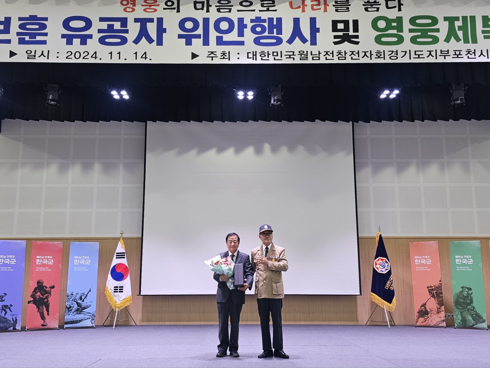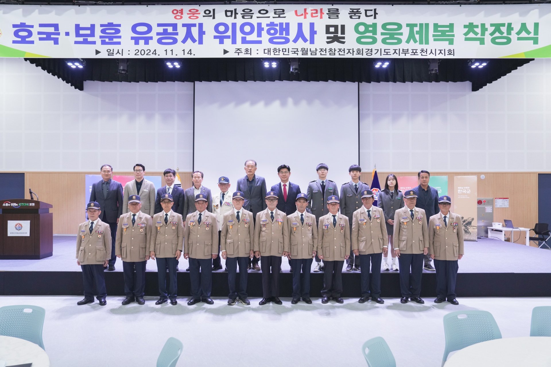 이번 행사는 포천시 월남전참전자회(회장 한용석) 주관으로, 나라를 위해 헌신하신 보훈 유공자분들을 위로하고 감사의 마음을 전하는 자리였습니다. 특히 영웅제복 착장식은 그분들의 숭고한 희생과 헌신을 기리는 특별한 순간이었습니다.