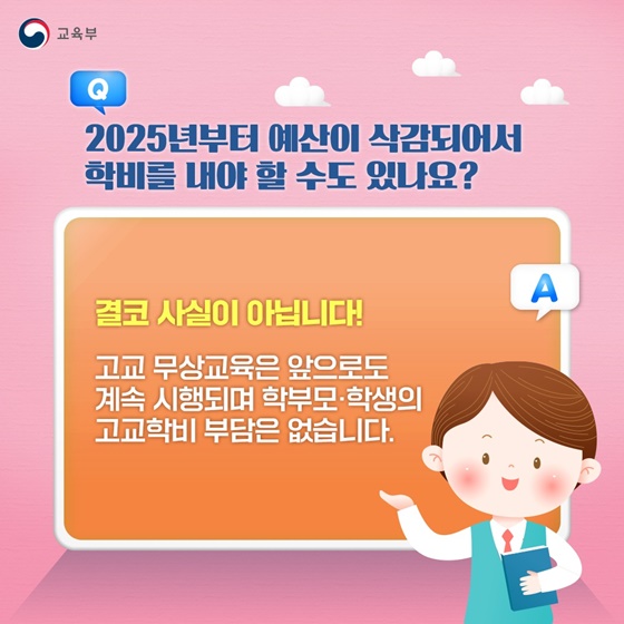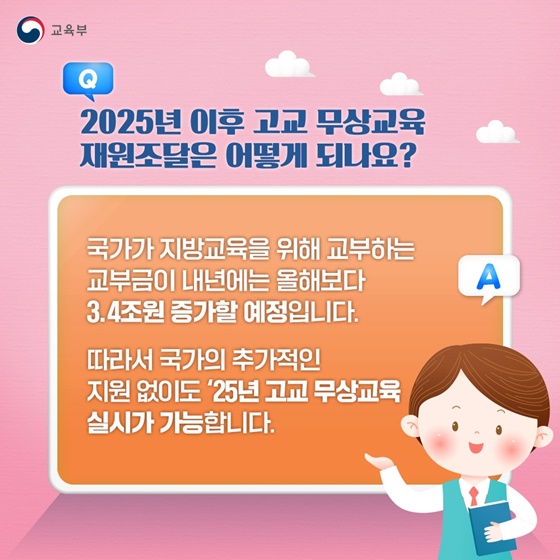 그럴 일은 없습니다. 내년도 지방교육재정교부금은 올해보다 약 3.4조 원 증가할 예정인데요. 이로 인해 국가의 추가 지원 없이도 2025년 고교 무상교육을 안정적으로 운영할 수 있습니다.