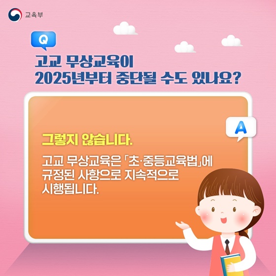 최근 고교 무상교육이 2025년부터 중단될 수도 있다는 소문이 들리는데요. 결론부터 말씀드리자면, 이 소문은 사실이 아닙니다. 고교 무상교육은 이미 「초·중등교육법」에 규정된 사항으로, 앞으로도 계속해서 안정적으로 시행될 예정입니다.