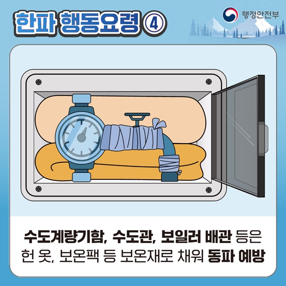 • 수도계량기함, 수도관, 보일러 배관 등은 헌 옷, 보온팩 등 보온재로 채우기