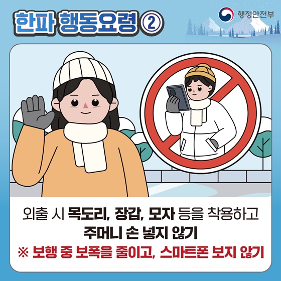 • 목도리, 장갑, 모자 착용 필수! 주머니에 손 넣지 않고 걸어야 안전합니다.