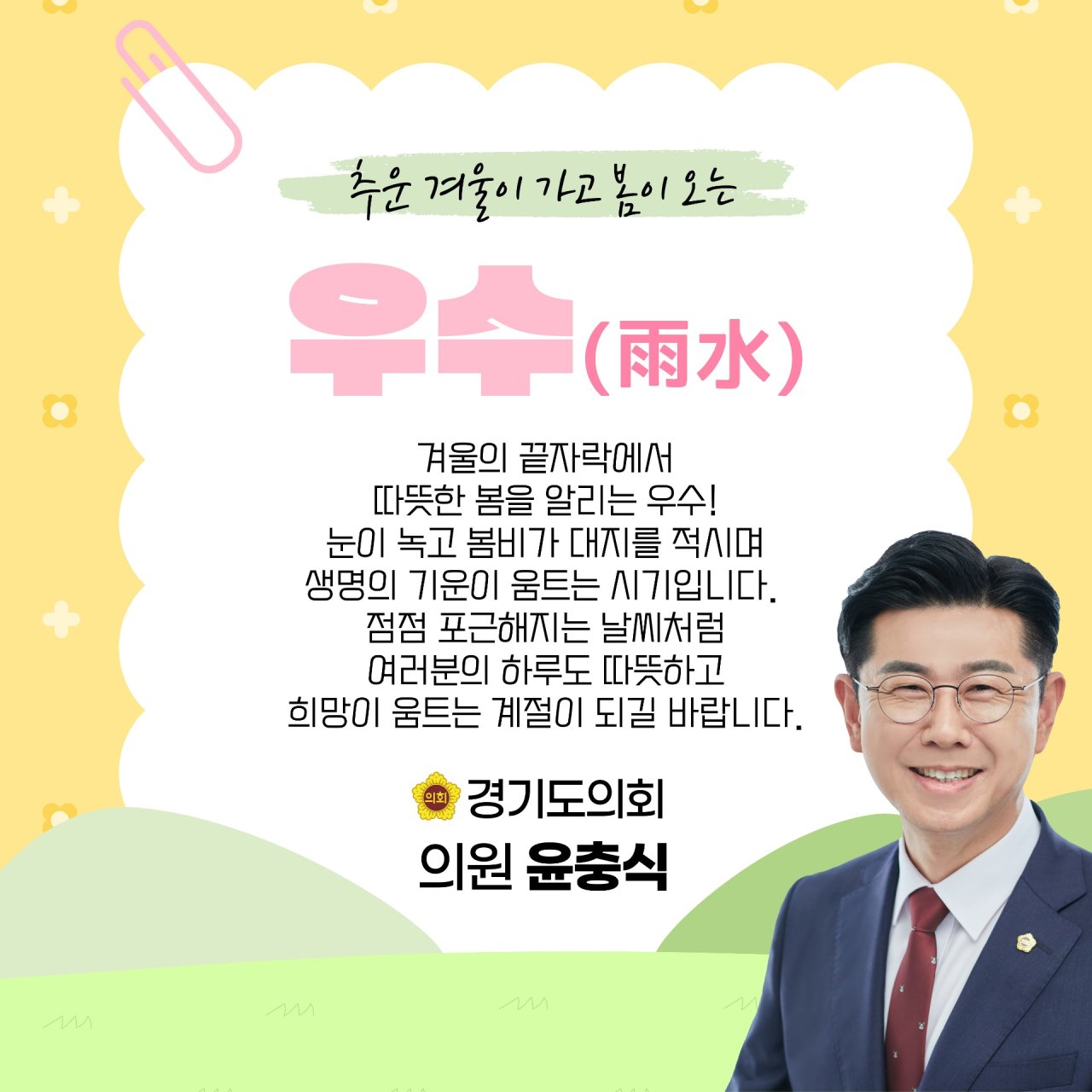 #우수 #봄이오는소리 #새로운시작 #행복한하루 #봄기운가득 #계절의변화 #따뜻한봄날 #희망의봄 #자연의선물 #봄맞이 #겨울의끝 #꽃피는계절 #포근한하루 #햇살가득 #기분좋은날 #설레는봄 #생명의기운 #희망의계절 #소소한행복 #좋은일가득 #건강하세요 #행복하세요 #마음까지따뜻하게 #경기도의회 #윤충식