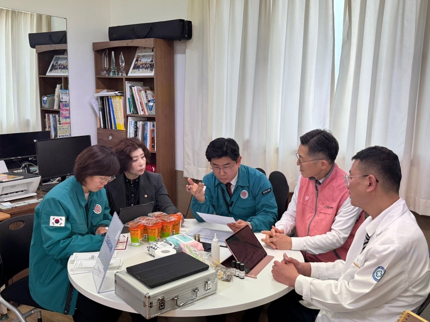 하지만 피해 주민분들께 제공할 치료제와 영양제 등이 부족한 상황입니다. 이에 경기도의료원 이필수 원장님, 포천의료원 백남순 원장님, 포천시 보건소 박은숙 소장님, 경기도의회 보건복지위원회 정경자 의원님과 함께 피해 현장인 노곡2리 마을회관에서 긴급 의료지원 현장회의를 가졌습니다.