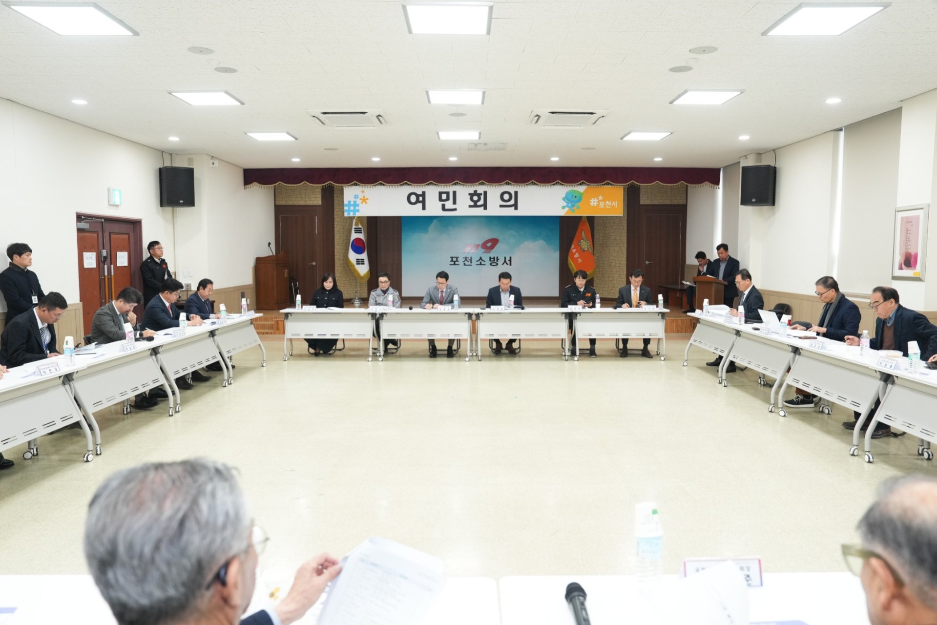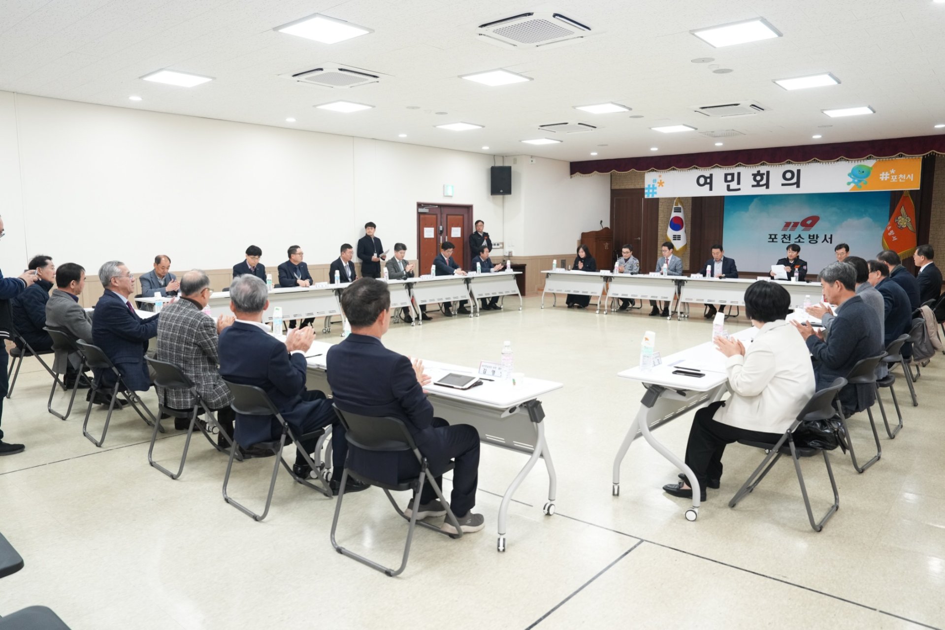 포천소방서에서 열린 포천시 여민회의에 참석하였습니다. 포천시의 각 기관 관계자들이 함께해 시정 및 단체별 주요 공지사항을 공유하고, 소방장비 시연회도 관람하는 시간을 가졌습니다.