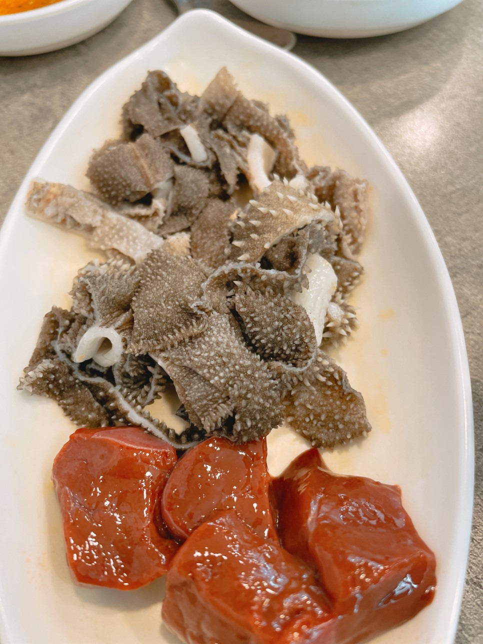 먼저, 천엽과 생간이 반찬들과 함께 나왔습니다.