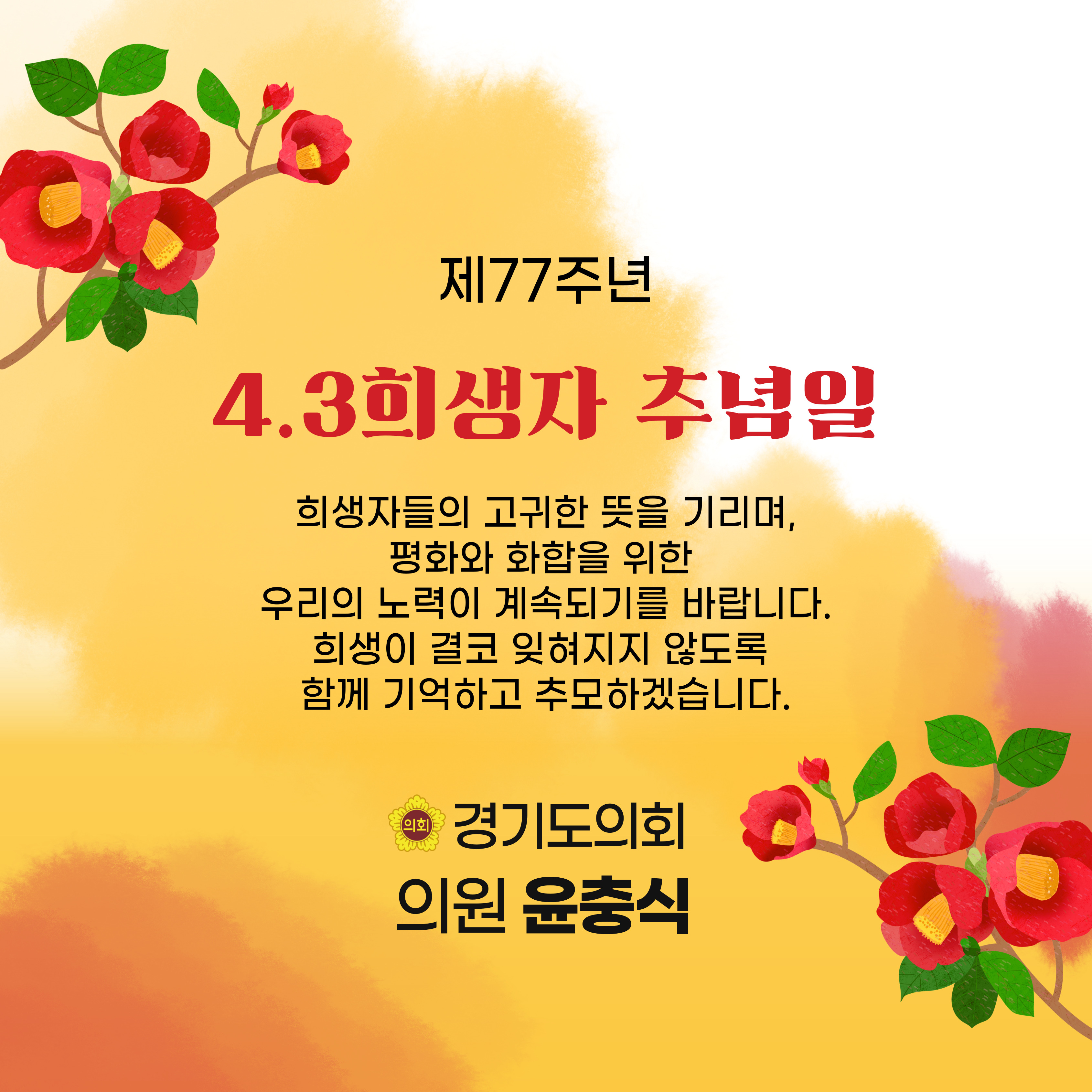 오늘은 제77주년 4.3희생자 추념일입니다. 77년 전, 제주도에서 일어난 비극적인 사건으로 많은 이들이 희생되었습니다. 아픔과 희생은 우리 역사에 깊은 상처로 남아 있습니다. 오늘 이 하루, 고귀한 희생을 기억하며, 평화와 화합의 가치를 되새기고자 합니다. 다시는 이러한 비극이 반복되지 않도록 서로의 상처를 보듬고, 화합과 이해의 길을 걸어가겠습니다. 희생자들과 유가족들에게 깊은 애도와 존경을 표하며, 그 뜻이 더욱 빛날 수 있도록 함께 노력하겠습니다.