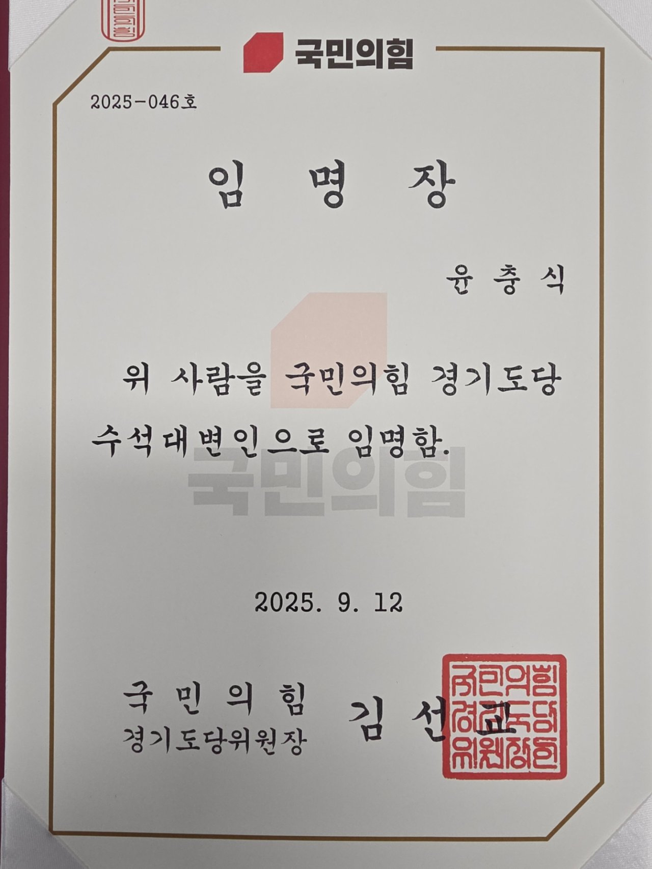 국민의힘 경기도당에서 개최된 주요당직자 임명식에서 수석대변인으로 임명장을 받았습니다. 막중한 책임을 맡겨주신 만큼, 도민 여러분의 목소리를 더욱 가깝게 듣고, 정책과 비전을 국민께 알리는 소통의 가교가 되겠습니다.