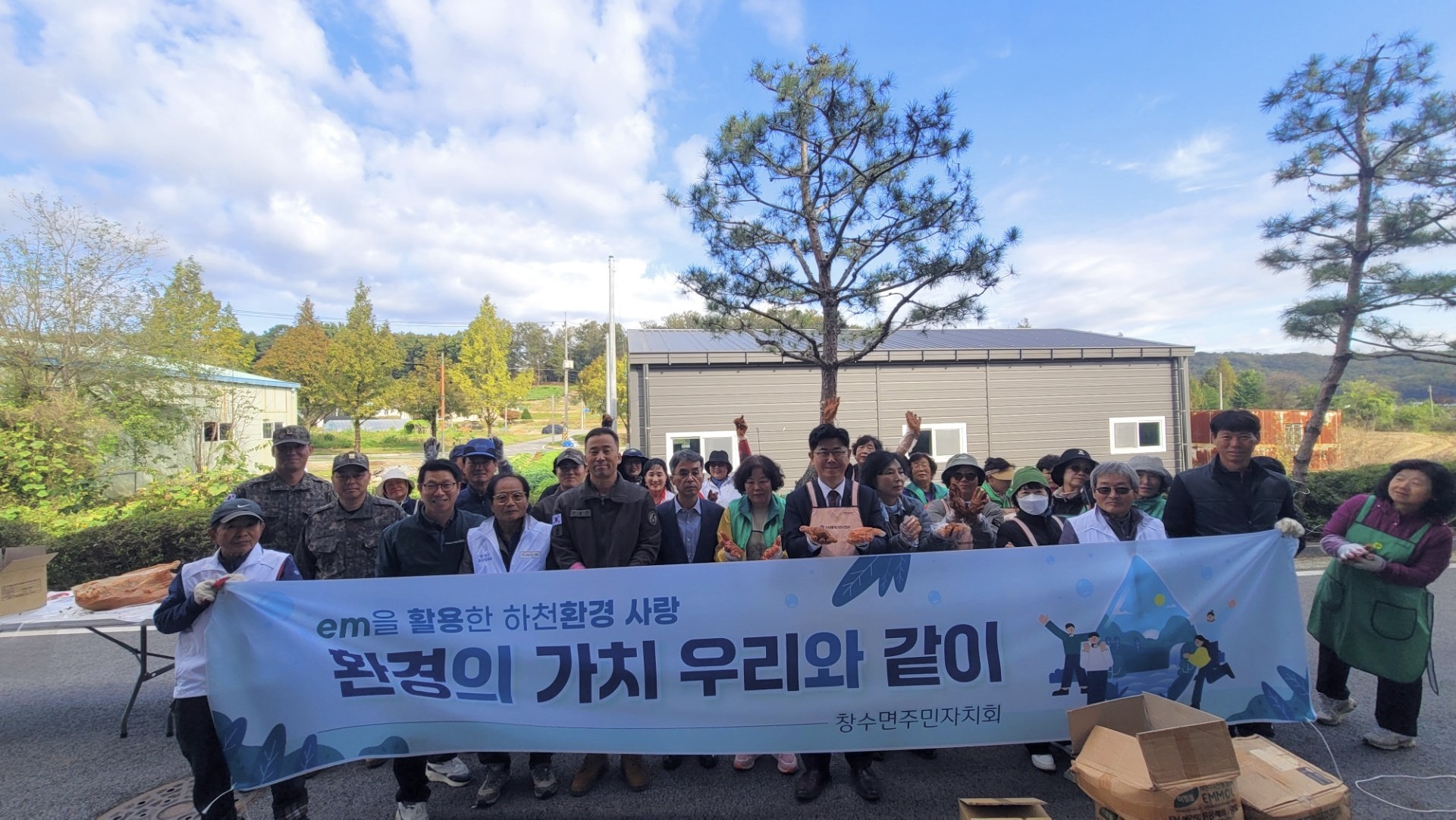 창수면 주민자치회(회장 윤종현), 새마을부녀회(회장 함금순), 생활개선회(회장 박정자), 5포병여단 주임원사와 임원들께서 함께 힘을 모아 ‘EM흙공 제작 및 던지기 행사’를 진행했습니다.