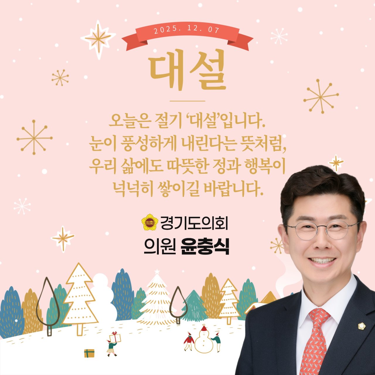 ❄️ 오늘은 절기 ‘대설’입니다. 눈이 넉넉히 내린다는 뜻처럼, 우리 삶에도 따뜻한 정과 행복이 차곡이 쌓이길 바랍니다.한 해의 마지막을 향해 가는 요즘, 잠시 쉼을 누릴 수 있는 주말이 더 소중하게 느껴집니다. 가족과 이웃, 그리고 사랑하는 이들과 따뜻한 시간 보내시고 마음의 온기까지 채우시길 바랍니다.평안한 주말 되시고, 여러분의 겨울이 포근한 미소로 가득하기를 기원합니다!