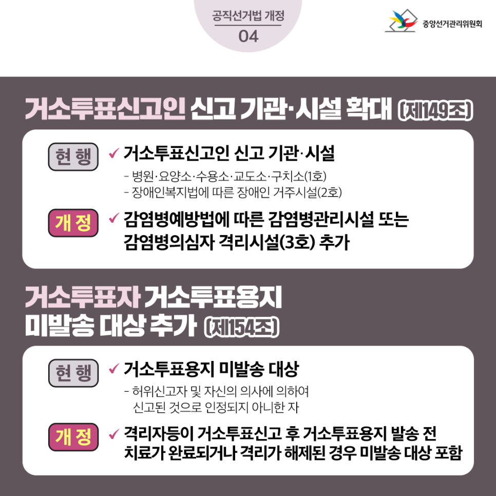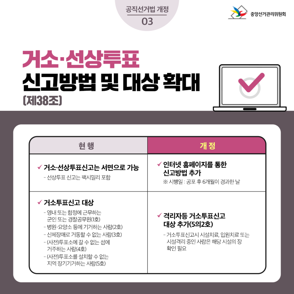 현 행개 정✔ 거소·선상투표신고는 서면으로 가능- 선상투표 신고는 팩시밀리 포함✔ 인터넷 홈페이지를 통한 신고방법 추가※ 시행일 : 공포 후 6개월이 경과한 날✔ 거소투표신고 대상- 영내 또는 함정에 근무하는 군인 또는 경찰공무원(1호)- 병원·요양소 등에 기거하는 사람(2호)- 신체장애로 거동할 수 없는 사람(3호)- (사전)투표소에 갈 수 없는 섬에 거주하는 사람(4호)- (사전)투표소를 설치할 수 없는 지역 장기기거하는 사람(5호)✔ 격리자등 거소투표신고 대상 추가 (5의2호)- 거소투표신고시 시설치료, 입원치료 또는시설격리 중인 사람은 해당 시설의 장 확인 필요거소투표신고인 신고 기관·시설 확대 (제149조)