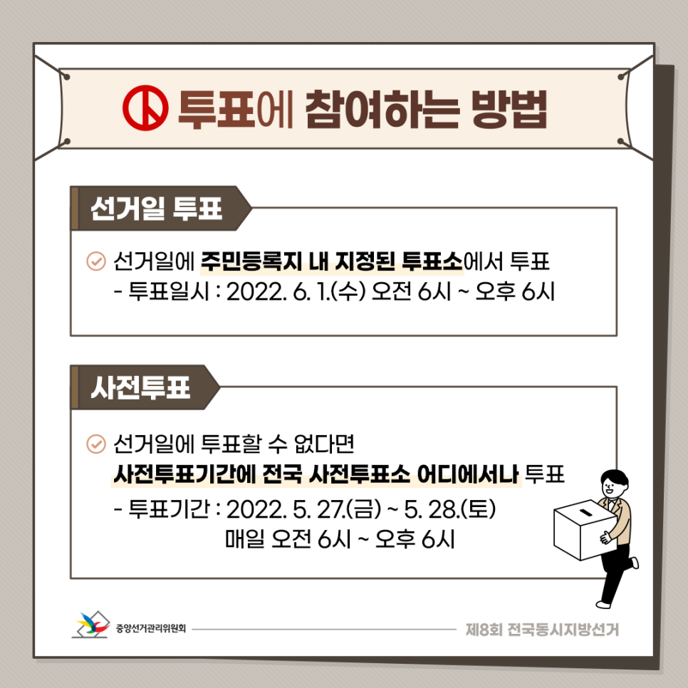 - 투표기간 : 2022. 5. 27.(금) ~ 5. 28.(토) 매일 오전 6시 ~ 오후 6시