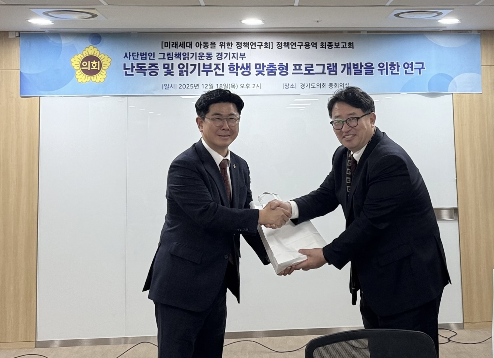 교육기획위원회 임광현 의원님의 연구단체 <미래세대 아동을 위한 정책연구회>에서 진행한 '난독증 및 읽기부진 학생 맞춤형 프로그램 개발을 위한 연구' 최종보고회가 개최되어 참석해 의견 개진을 하고 성공적으로 연구회가 마무리 되는것을 축하드렸습니다.