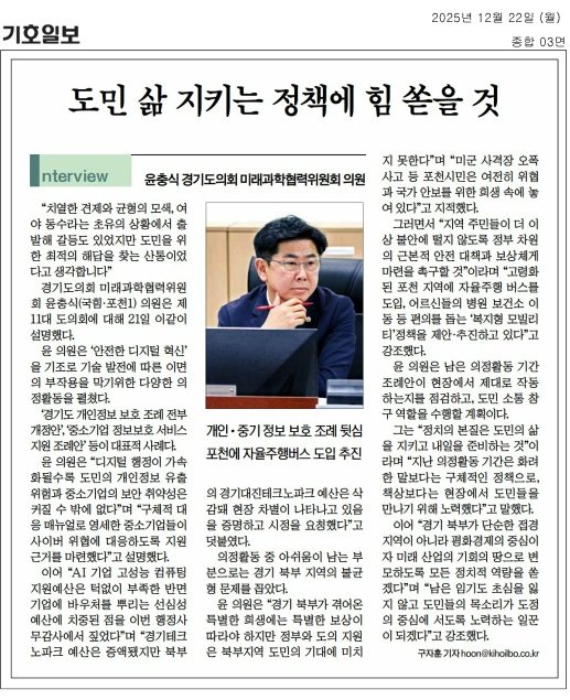 #기호일보 #언론인터뷰 #도민의삶 #정책으로증명 #현장중심정치 #제도로말하다 #경기도의회 #경기도의원 #윤충식 #수호1004윤충식 #윤충식경기도의원반응형LIST