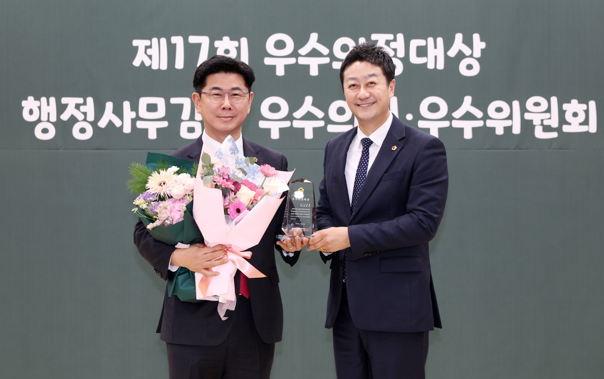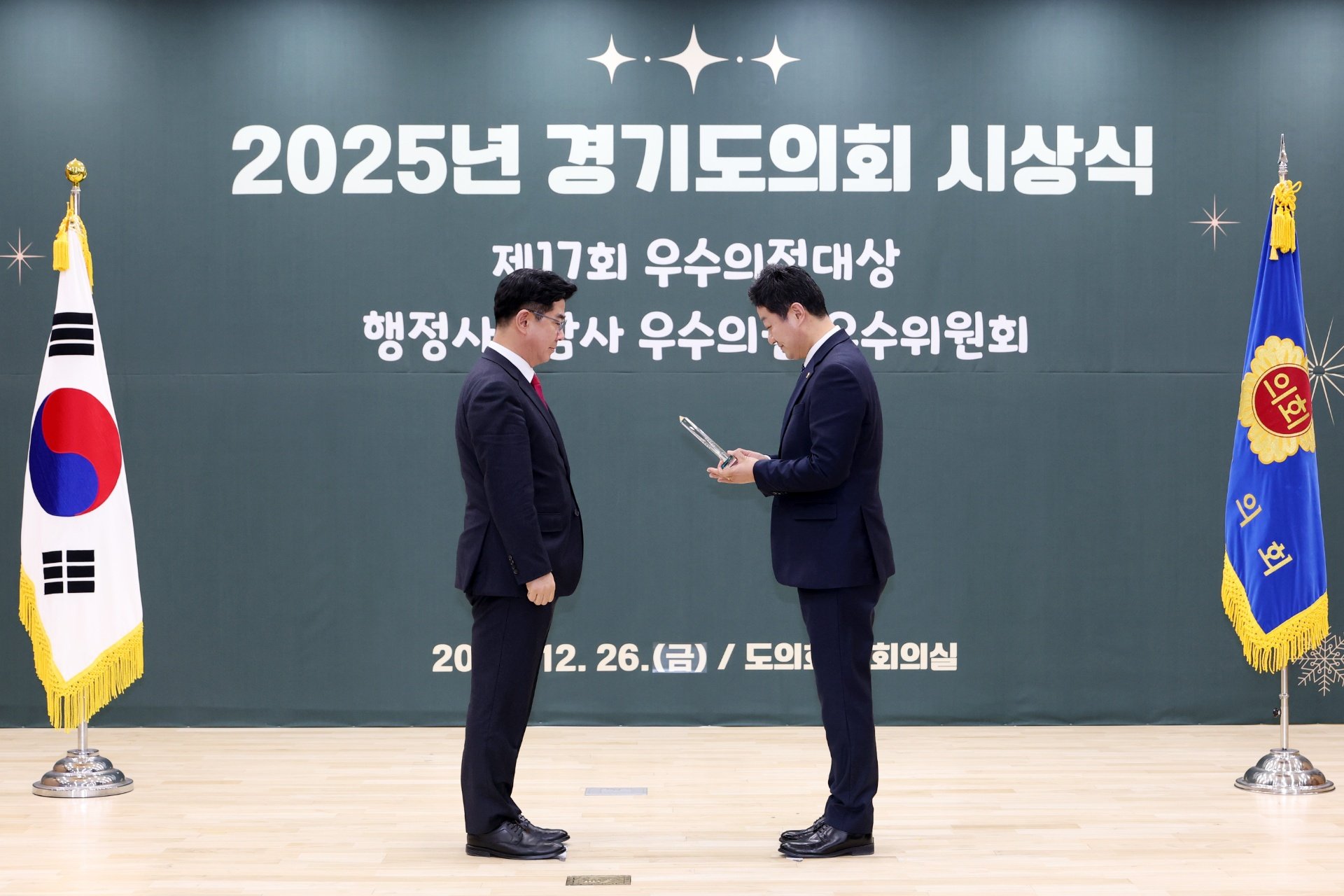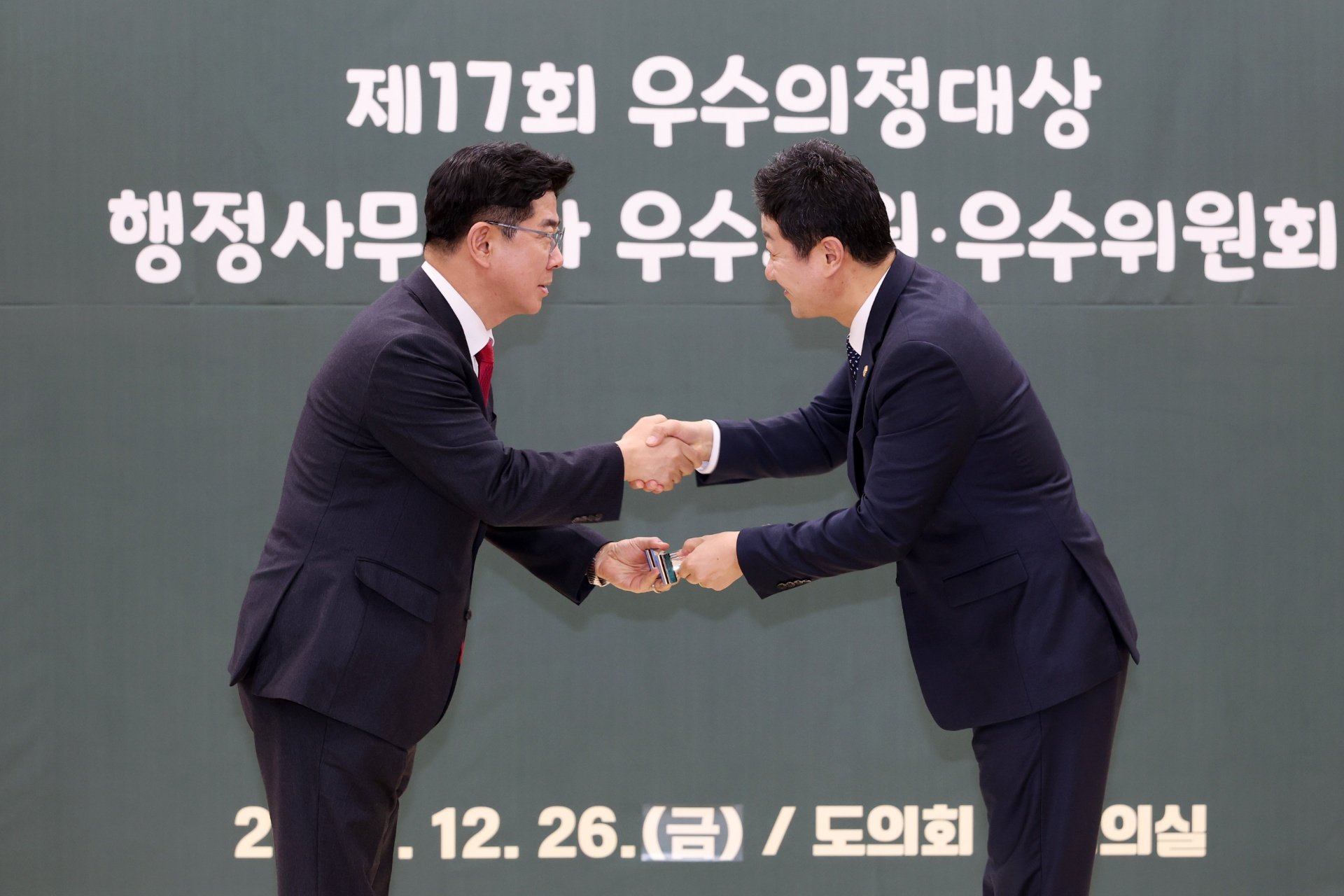 경기도의회 대회의실에서 열린 대한민국시도의회의장협의회 주최 제17회 우수의정대상 시상식에서 대상을 수상하는 큰 영광을 안았습니다.