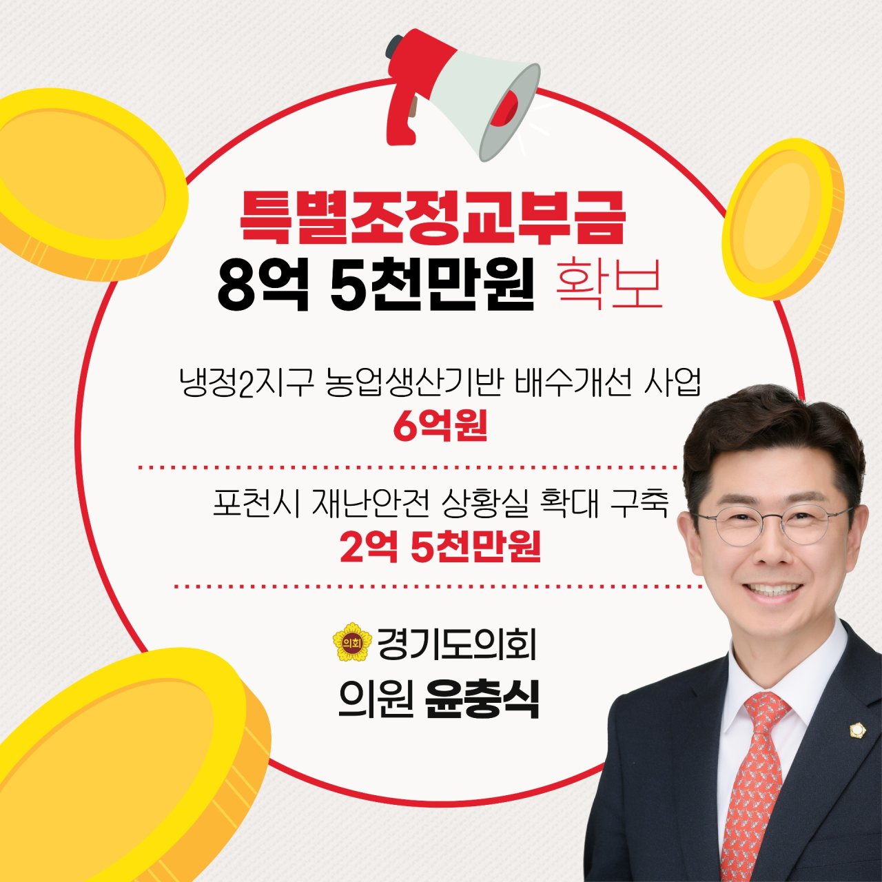📢 포천의 꼭 필요한 현안 사업을 위해 특별조정교부금 8억 5천만 원을 확보했습니다.