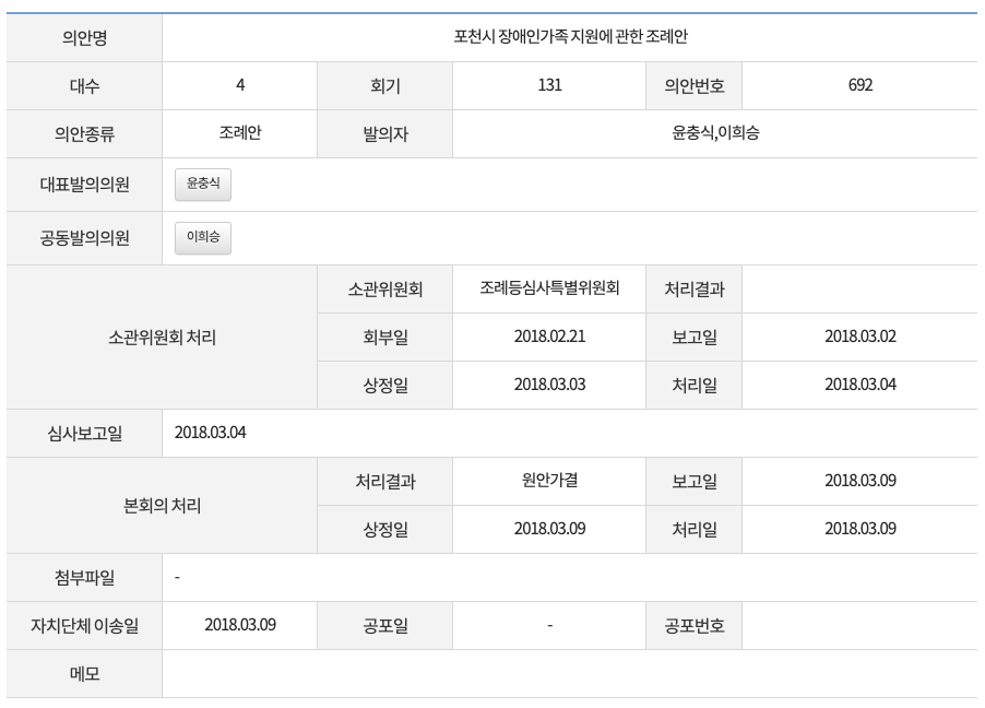 4대 포천시의회 윤충식 의원, 장애인가족 삶의 질 향상을 위한 조례안 발의소소한 일상들 2021. 7. 22. 22:59반응형SMALL2018년 3월 2일 4대 포천시의회 윤충식 (前) 의원이 대표 발의한 [포천시 장애인가족 지원에 관한 조례]는  포천시 사회복지사협회 운영위원으로 활동하고 있는 윤충식 운영위원이 포천시의회 의원으로 재직 하던 2018년 발의한 조례이다. 이 조례를 발의하게 된 이유는 "포천시에 거주하는 장애인가족 구성원들의스트레스와 복지 욕구를 해결하여삶의 질을 향상시키고 같은 사회 구성원으로서차별 없고 소외되지 않도록 적극적으로 지원하기 위하여"라고 밝혔다.  이 조례를 토대로 포천시 사회복지사협회 윤충식 운영위원은 장애인가족을 효과적으로 지원할 수 있도록 매년 지원계획을 수립하고 장애인가족의 돌봄 및 휴식 지원에 관한 사업, 장애인 가족에 대한 이해와 인식 개선을 위한 사업 등 구체적인 지원사업을 명시하여 예산의 범위 내에서 지원할 수 있는 근거 규정을 마련했으며, 지원사업의 원활한 시행을 위하여 상위법에 따라 전문 수행기관을 지정하고 지도감독하는 내용을 포함했다.  포천시 사회복지사협회 운영위원이자 포천시의회 4대 의원으로 활동했던, 윤충식 전 의원이 발의한 조례는 장애인 가족 지원을 통해 경제적 부담과 심리 및 정서적 부담 그리고 신체적, 사회적 부담을 덜어 줌으로써 양육부담을 완화시킬 수 있도록 했다.  반응형LIST 반응형LIST'소소한 일상들' 카테고리의 다른 글포천중 학교폭력 예방 캠페인, 시민과 함께하는 윤충식 (0) 2021.08.28 윤충식 前 포천시의회 의원, MBC '지방자치 30주년 국민이 만드는 나라' 국민 논객으로 참여 (0) 2021.08.25 사랑의 나들목 주거환경개선 봉사활동, 일꾼 윤충식 (0) 2021.07.15 관인노인복지센터 취약계층 결식방지를 위한 밑반찬배달 사업 실시 (0) 2021.07.15 포천초등학교 학교폭력예방 캠페인, 시민과 함께하는 윤충식 (0) 2021.07.15