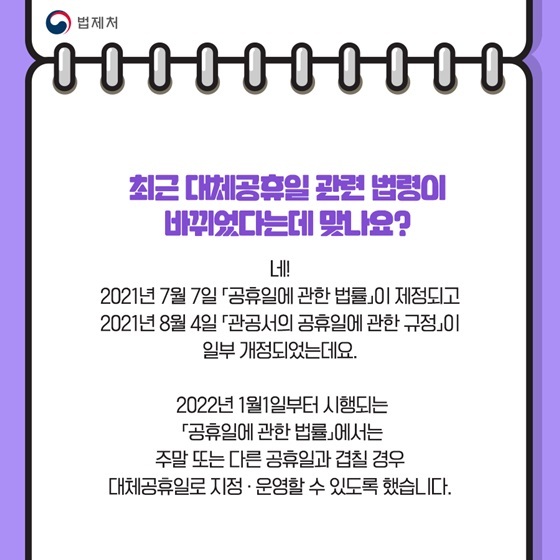 최근 대체공휴일 관련 법령이 바뀌었다는데 맞나요?