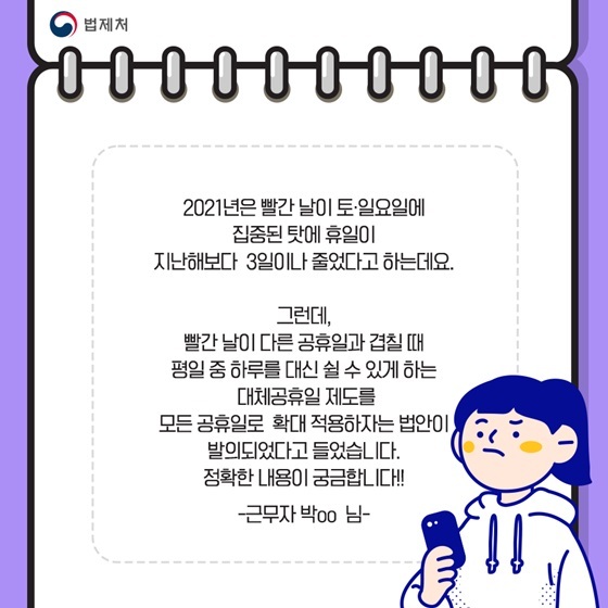 ✳ 빨간 날이 다른 공휴일과 겹칠 때 평일 중 하루를 대신 쉴 수 있게 하는