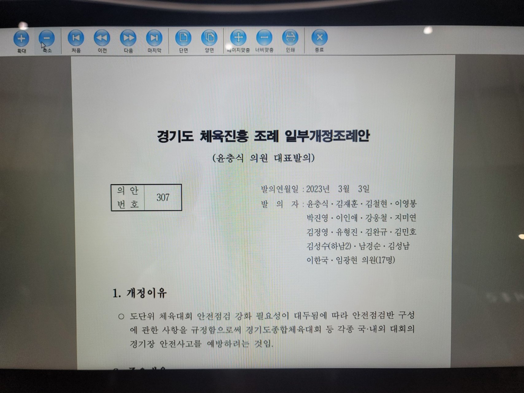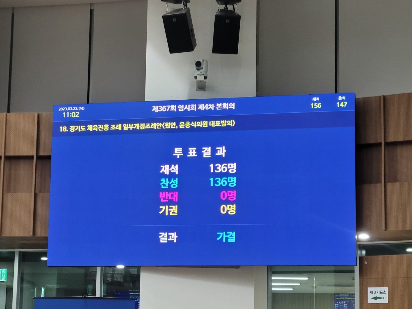 이태원 참사 이후 대규모 행사에 안전점검 강화 필요성이 대두됨에 따라 도단위 체육대회 안전점검반 구성에 관한 사항을 규정함으로써 경기도종합체육대회 등 각종 국·내외 대회의 경기장 안전사고를 예방하고자 한 경기도 체육진흥 조례 일부개정조례안이 지난번 상임위원회에서 통과에 이어 오늘 본회의에서 136명 재석에 136명 찬성으로 가결되었습니다.