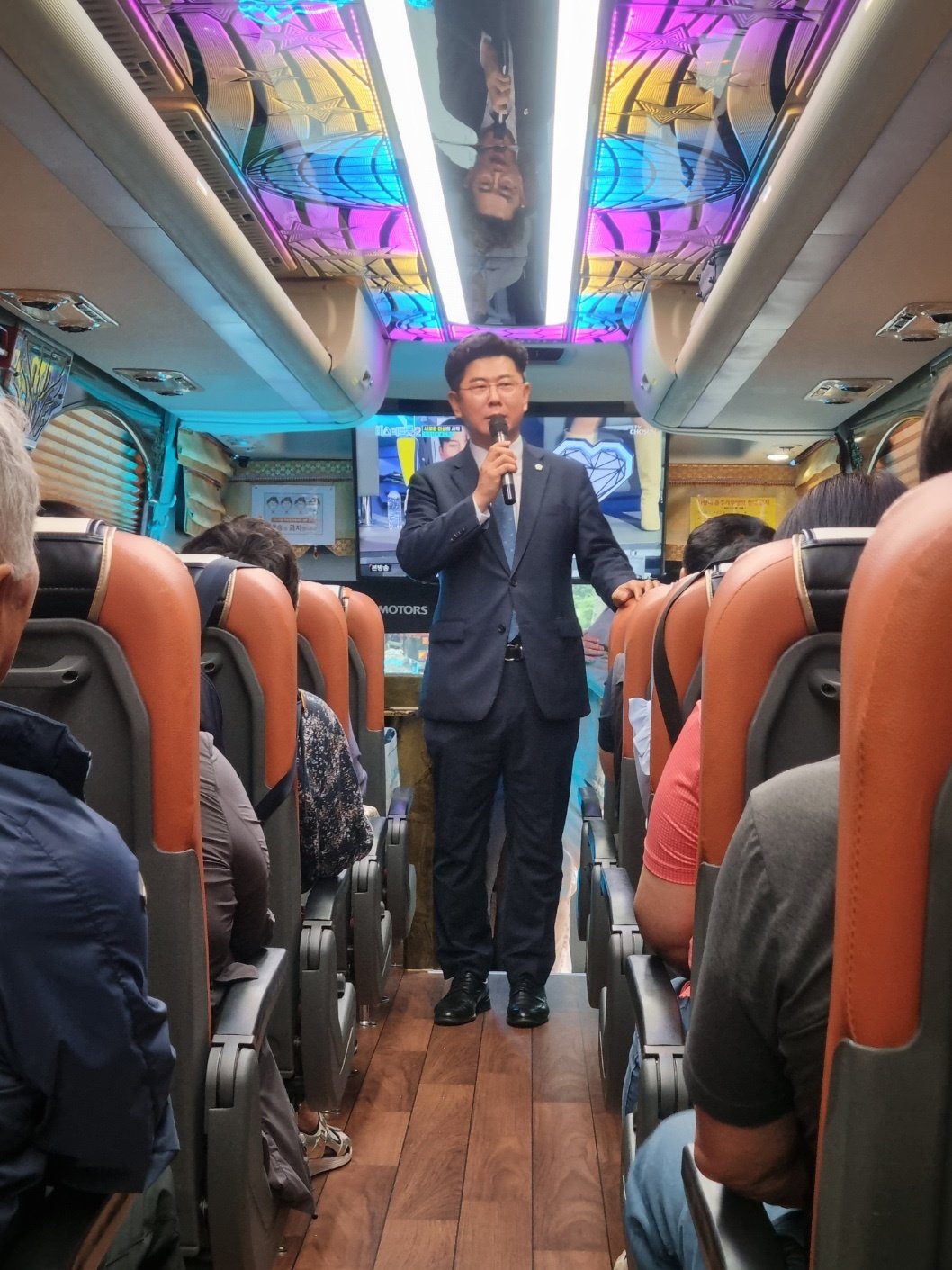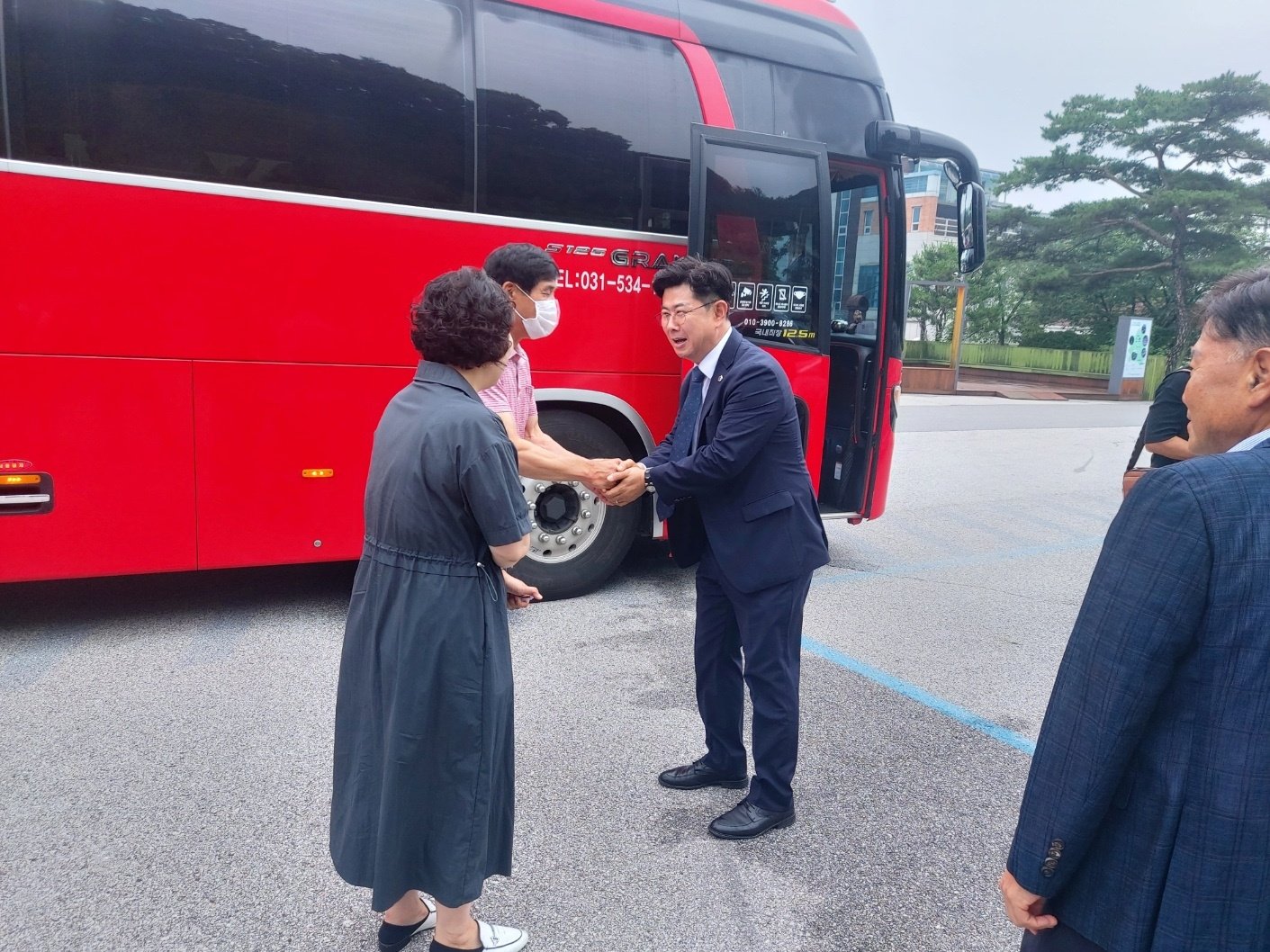 지난주 금요일 역량강화교육에 이어 벤치마킹 등을 위한 선진지견학과 워크샾을 떠나시는 군내면 지도자님들께 인사드리는 것으로 새로운 한 주의 아침을 시작했습니다.