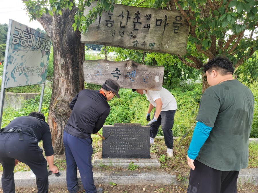 이춘수 면장님과 직원들이 금동2리 입구에 쓰러져 있던 비석을 바로세우는 작업을 하고 있습니다.