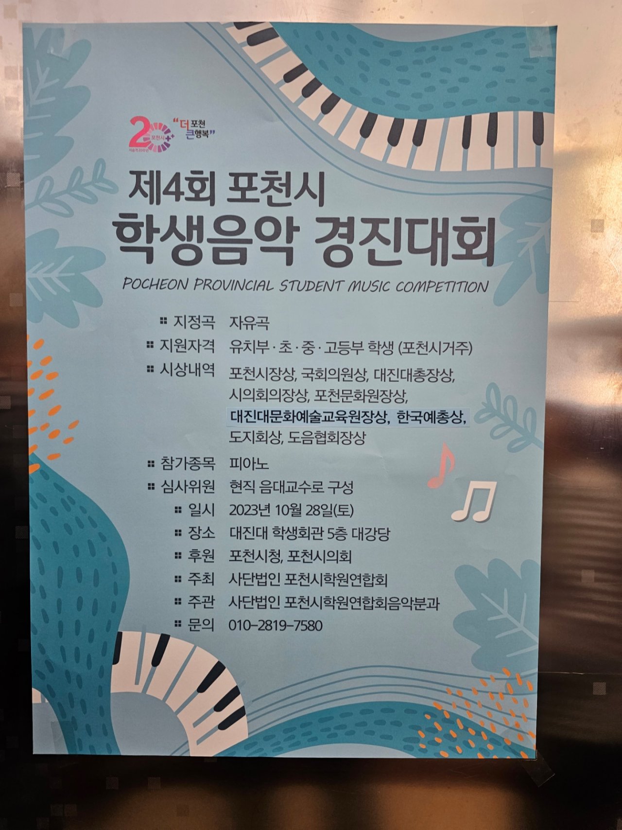 포천시학원연합회(회장 유연남)에서 주최하고 학원연합회 음악분과에서 주관한 학생음악 경진대회에 참석해 인사드렸습니다. 대진대 평생교육원 원장님이신 김정완 교수님께서도 함께 해주셨습니다!