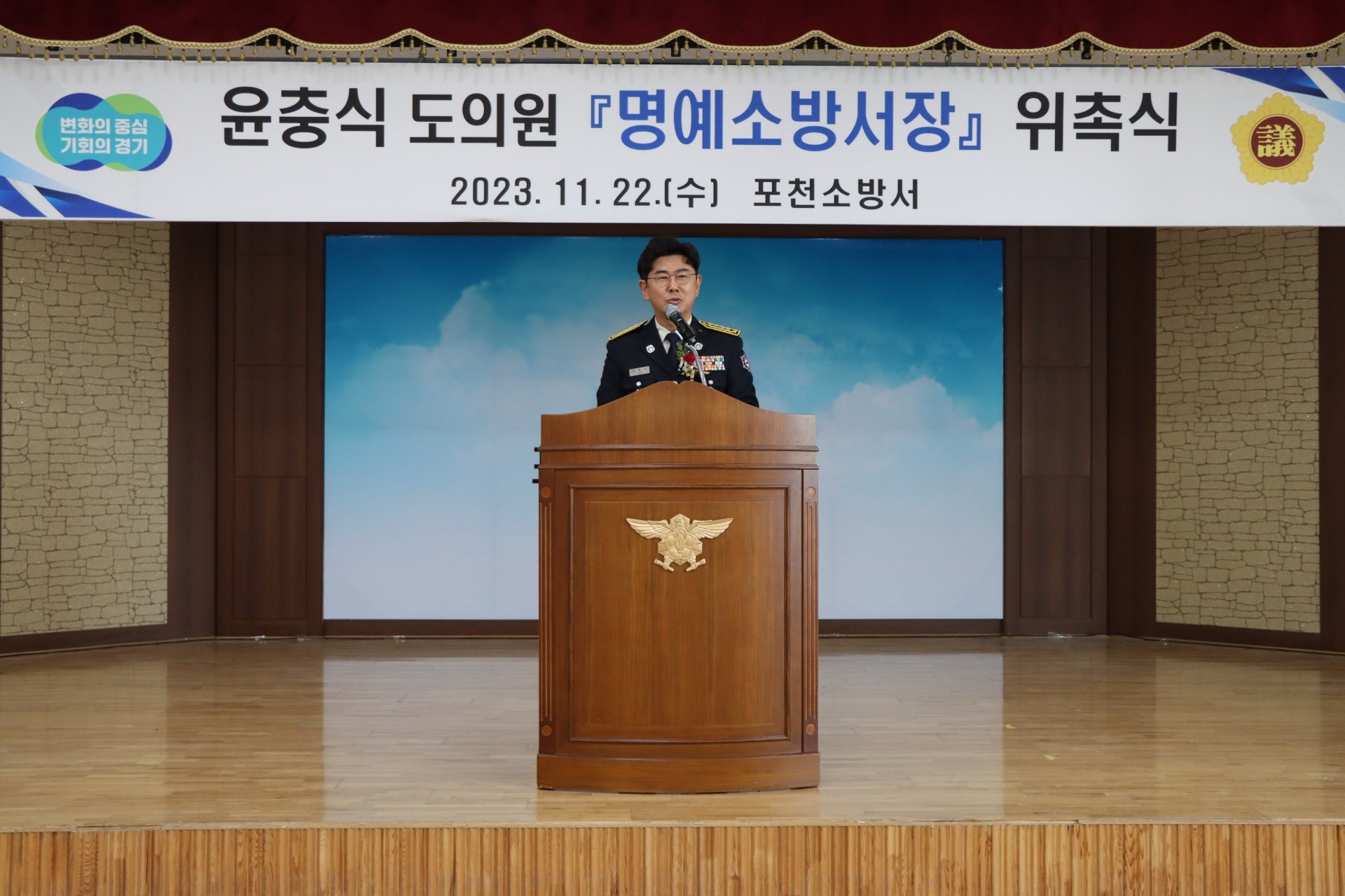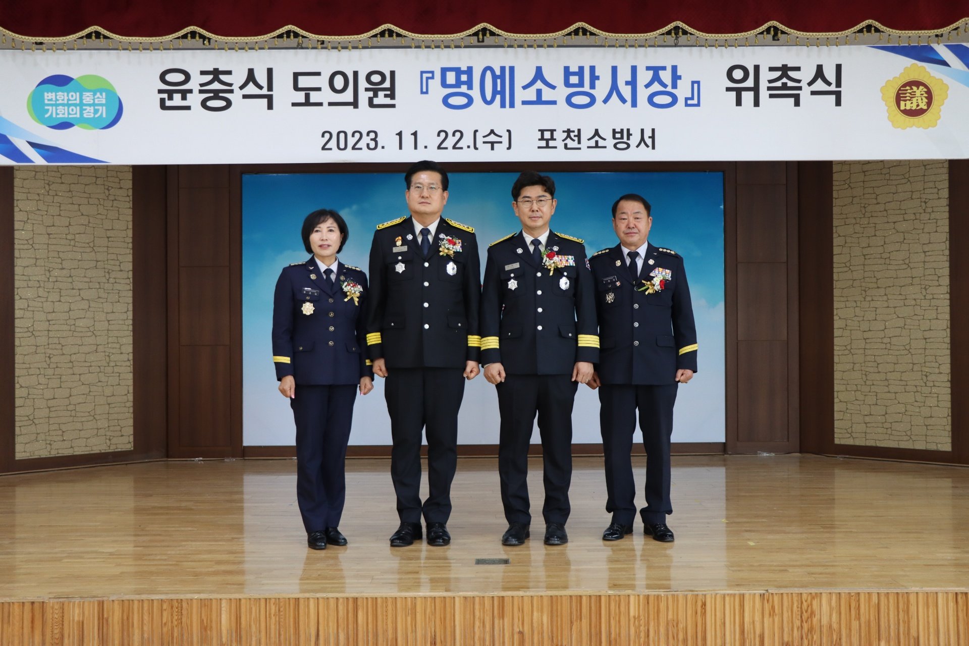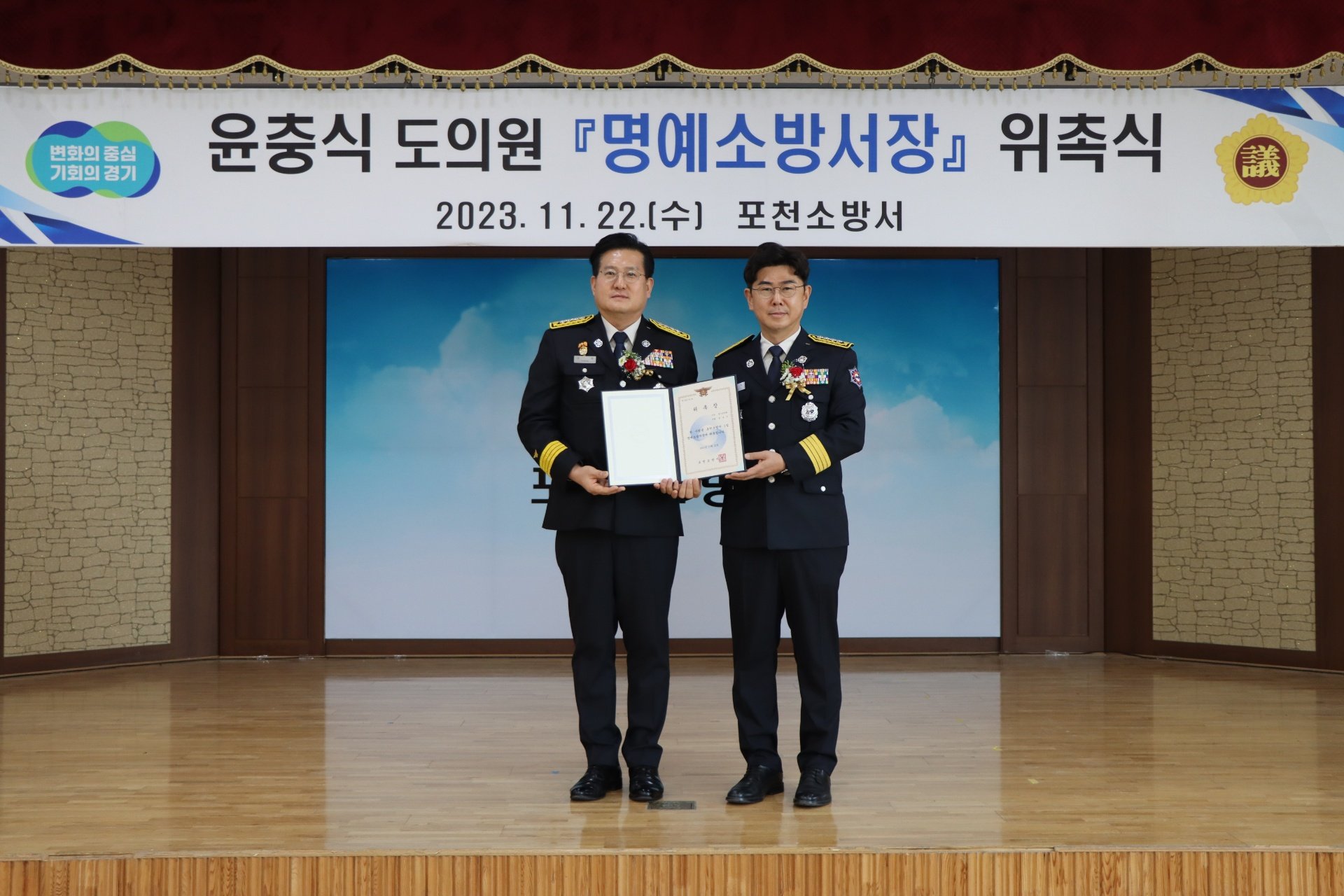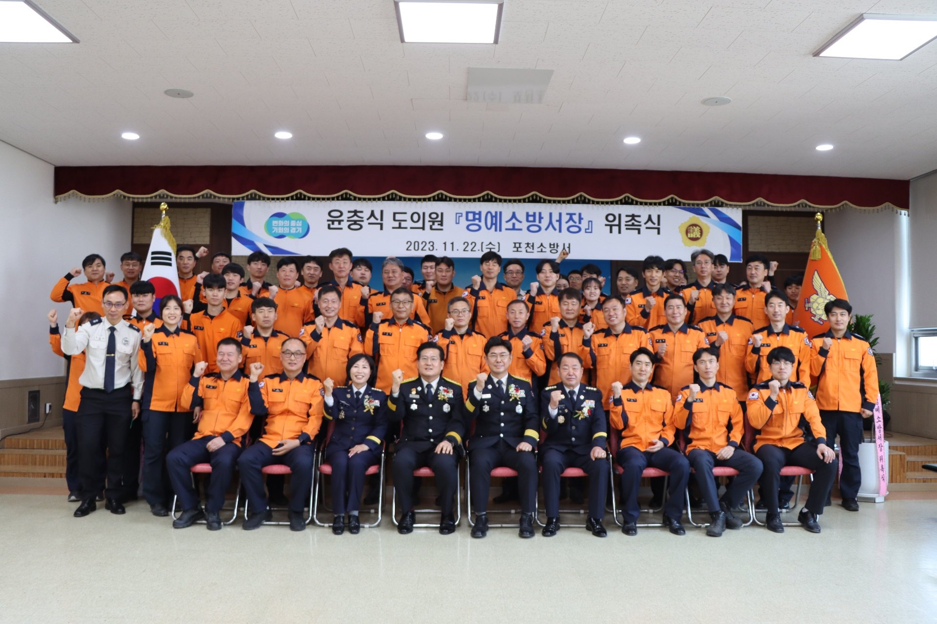 📰 포천소방서는 22일 경기도의회 윤충식 의원을 포천소방서 1일 명예소방서장으로 위촉했다.