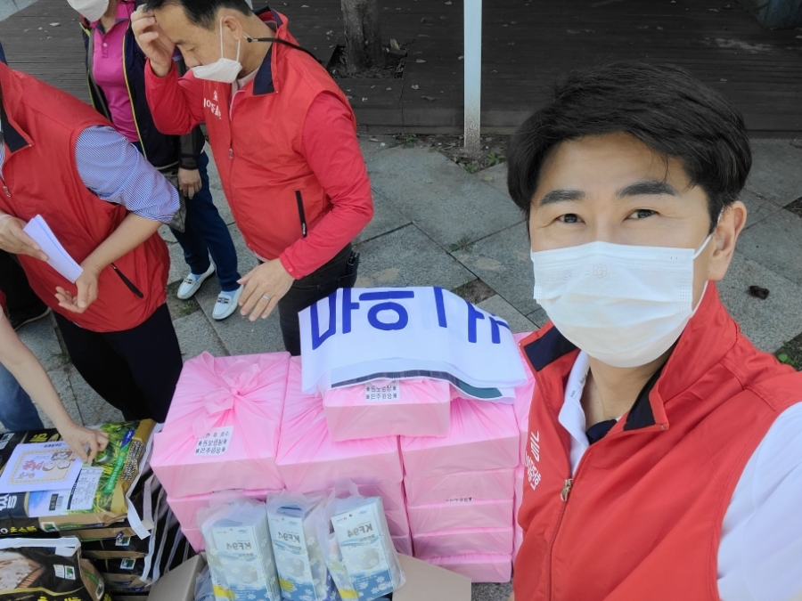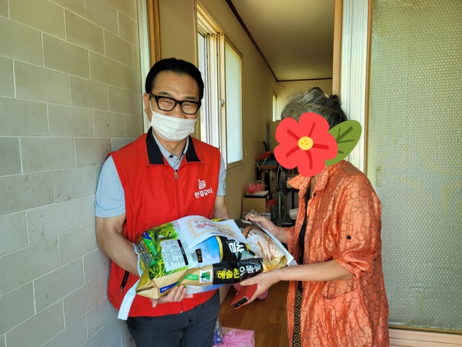회원분들의 기부로 마련된 쌀과 버섯, 마스크 등을 2인1조로 독거어르신들 각 가정에 전달해 드렸습니다