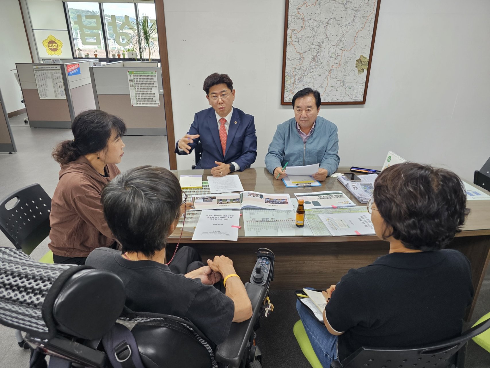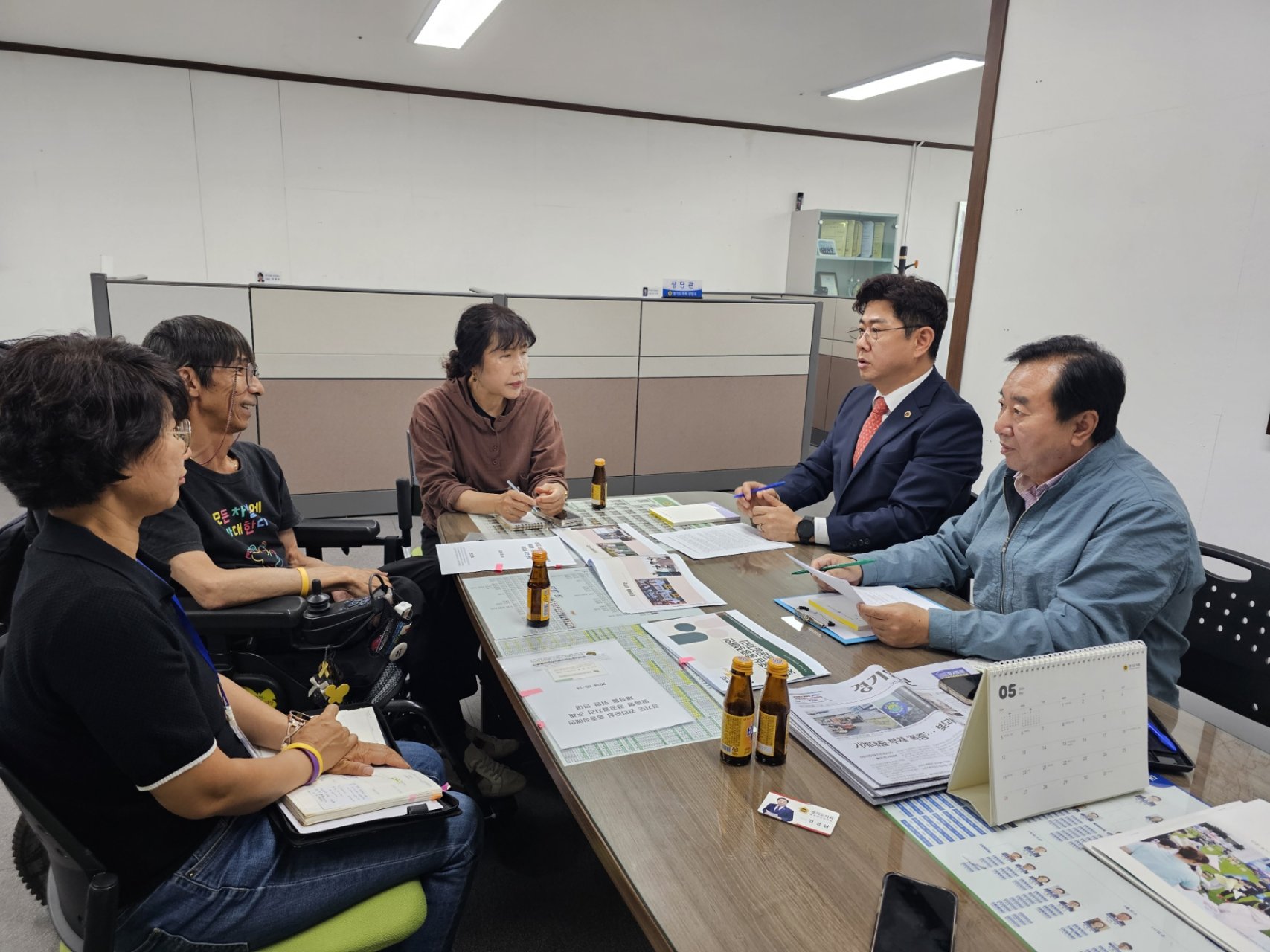 포천나눔의집장애인자립생활센터 이영봉 센터장님을 비롯한 임원분들이 도의회 상담소를 찾아주셔서 김성남 의원님과 함께 중증장애인 맞춤형 공공일자리 지원에 대한 의견을 나눴습니다.