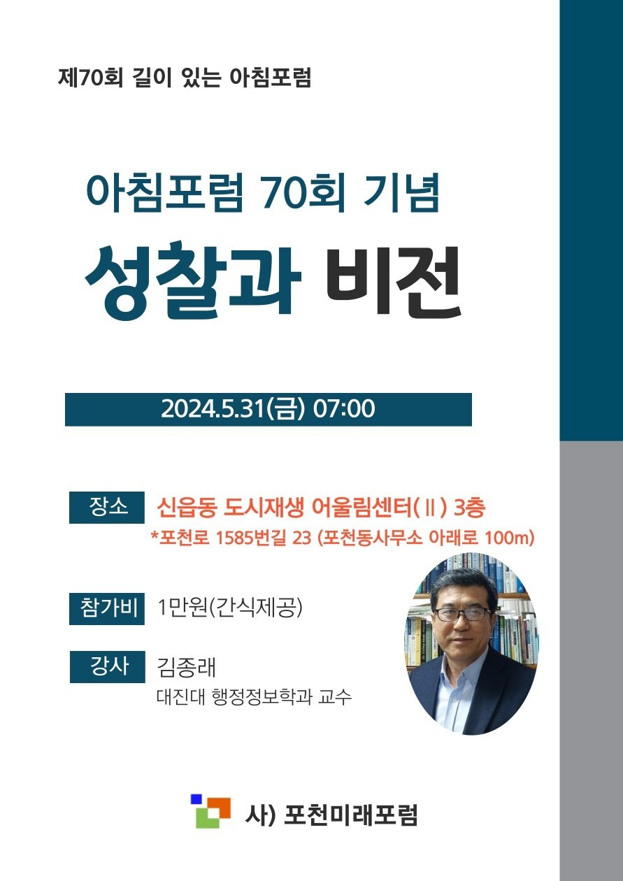 길이 있는 아침포럼 70회 기념으로 포럼에 대한 성찰과 비젼이라는 주제로 대진대학교 김종래교수님으로부터 뜻깊은 강의가 있었습니다.