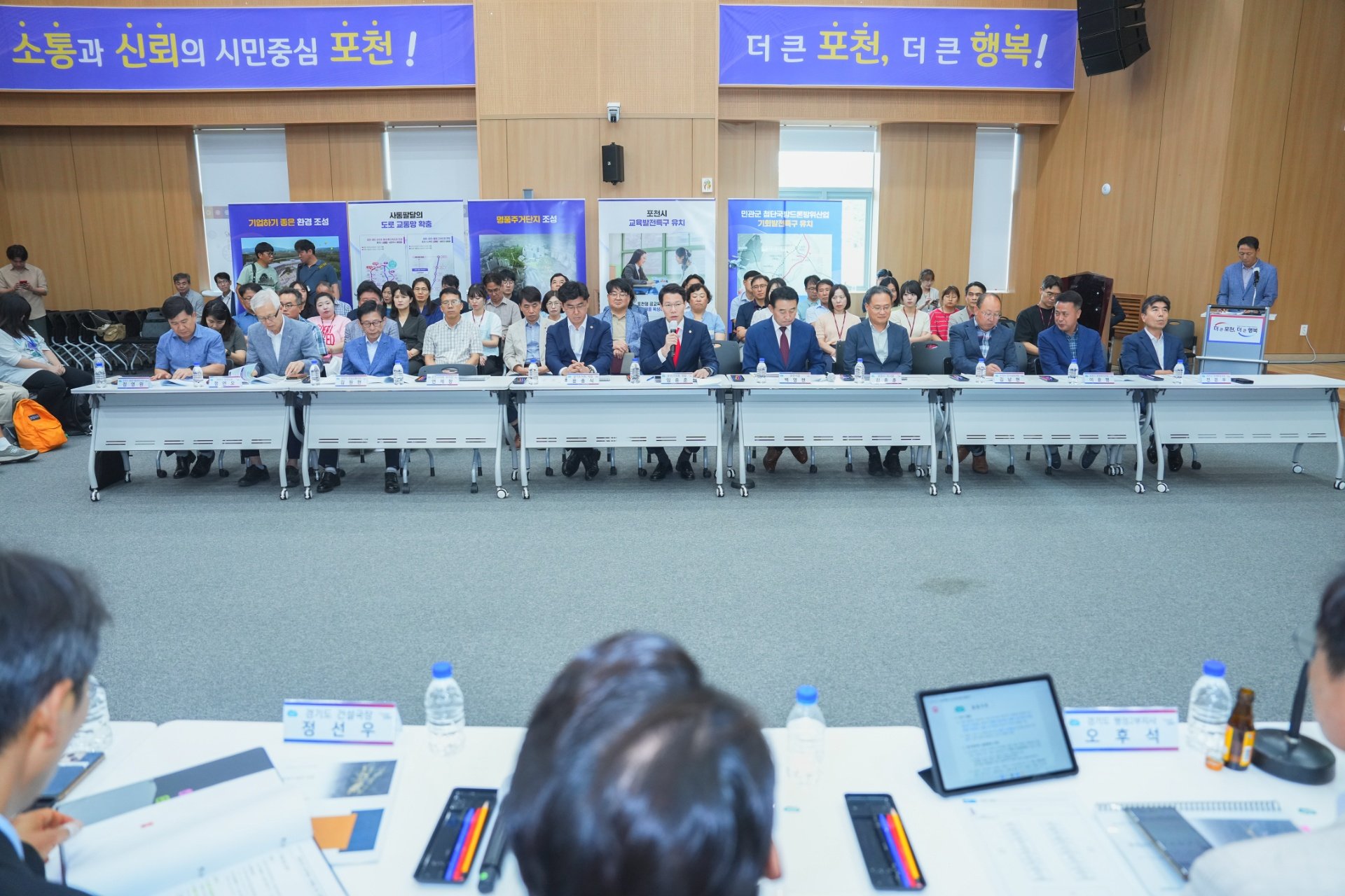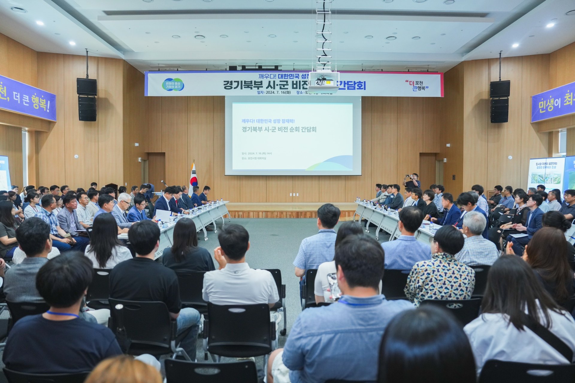 경기북부 시·군 비전 순회 간담회가 포천시청 신관 2층 대회의실에서 개최되었습니다. 이번 간담회는 경기북부특별자치도 시·군별 비전 수립 최종결과와 경기북부 규제 해소 및 특례, 대개발 추진성과를 설명하기 위해 마련되었습니다.