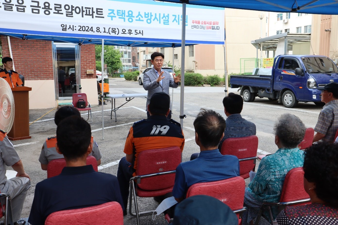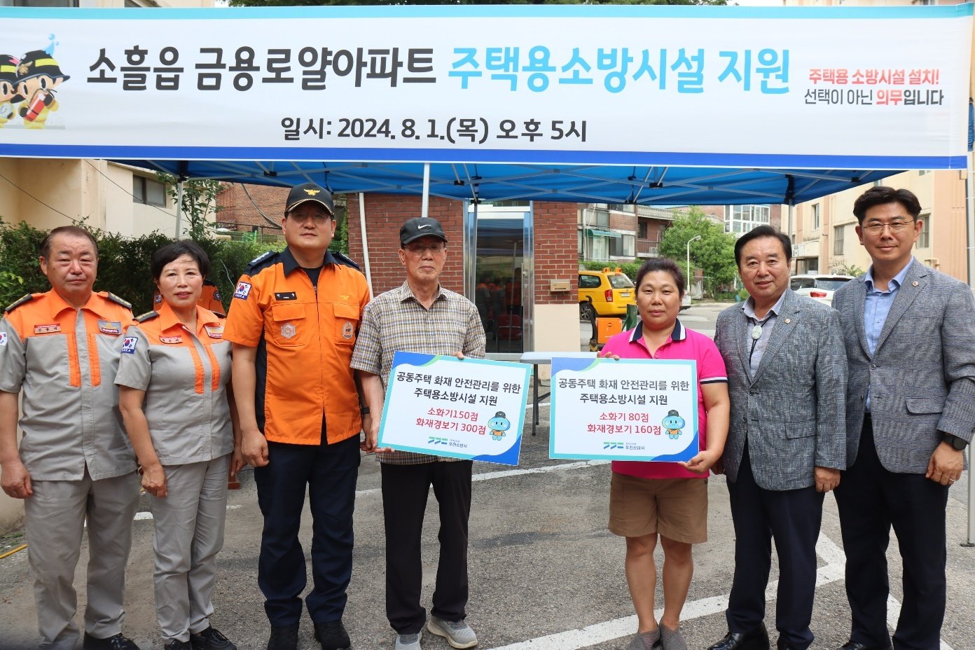 포천소방서(서장 권웅)와 함께 소흘읍 금용로얄아파트 230가구 전세대에 화재경보기 2대와 소화기 1개씩을 전달하는 행사를 실시하였습니다.