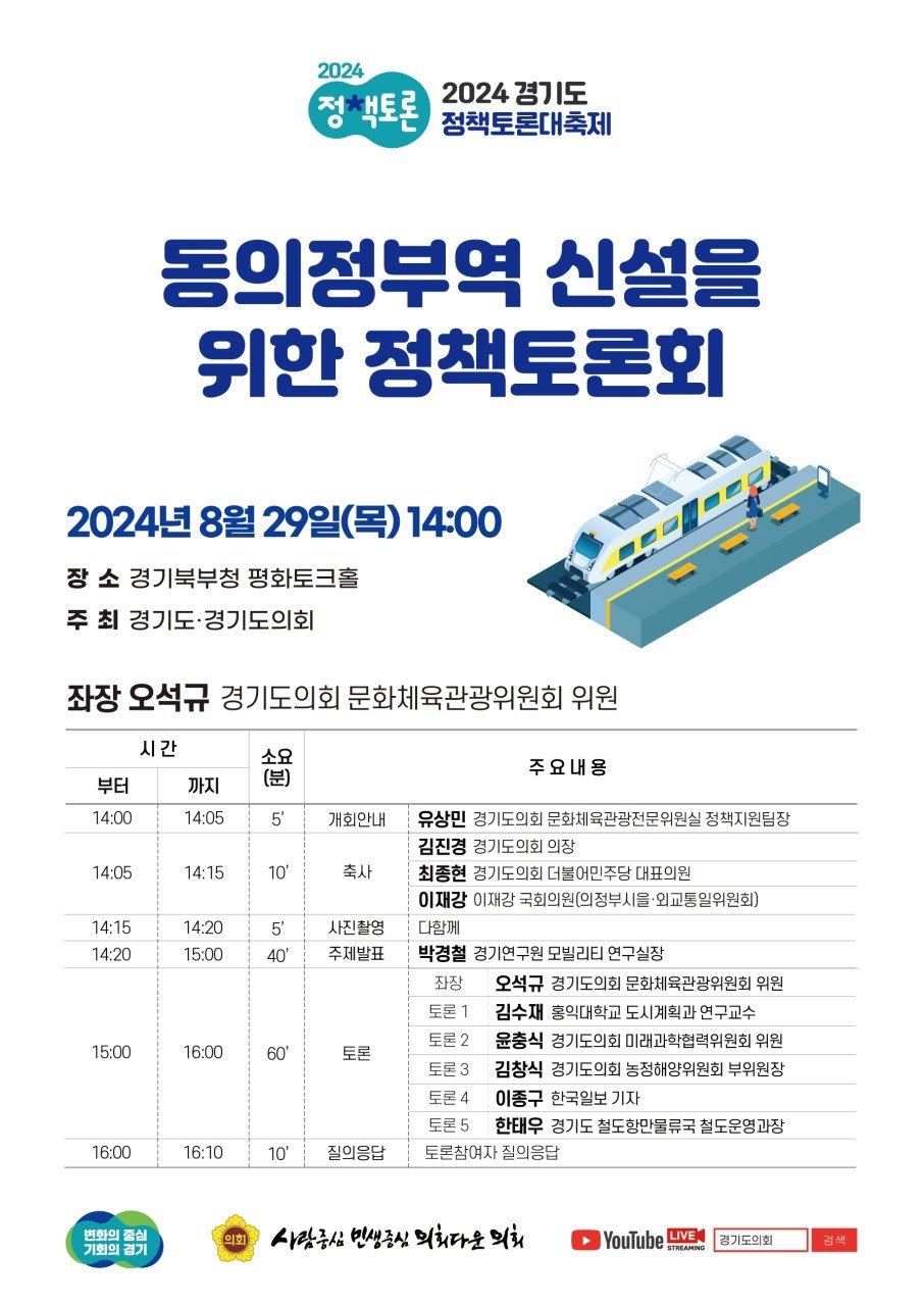 경기도 정책토론대축제의 일환으로 오석규의원이 주최한 '동의정부역 신설을 위한 정책토론회'에 참석해 GTX-G노선 및 8호선 의정부 연장 등 경기북부 철도망 구축의 중요성을 논의했습니다.